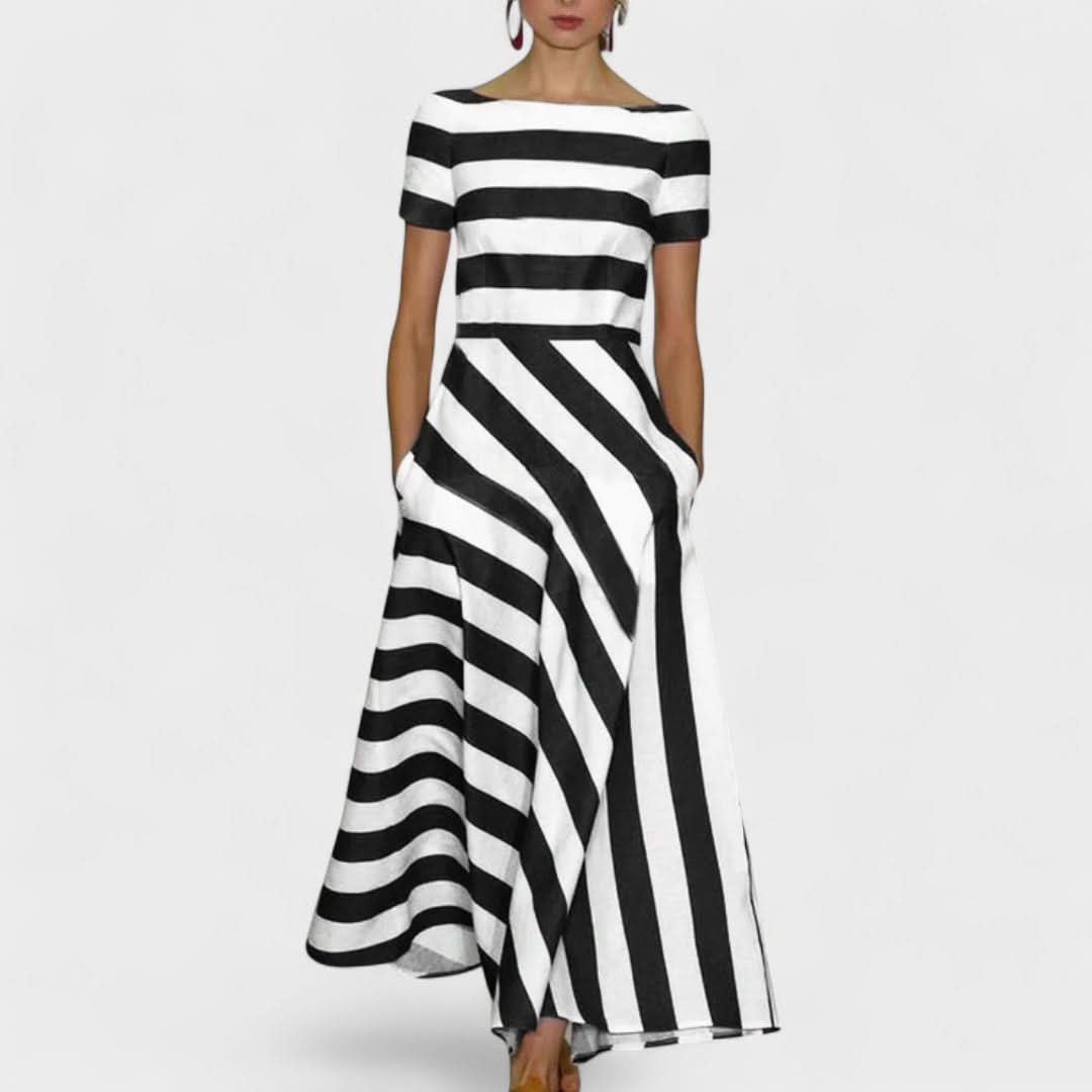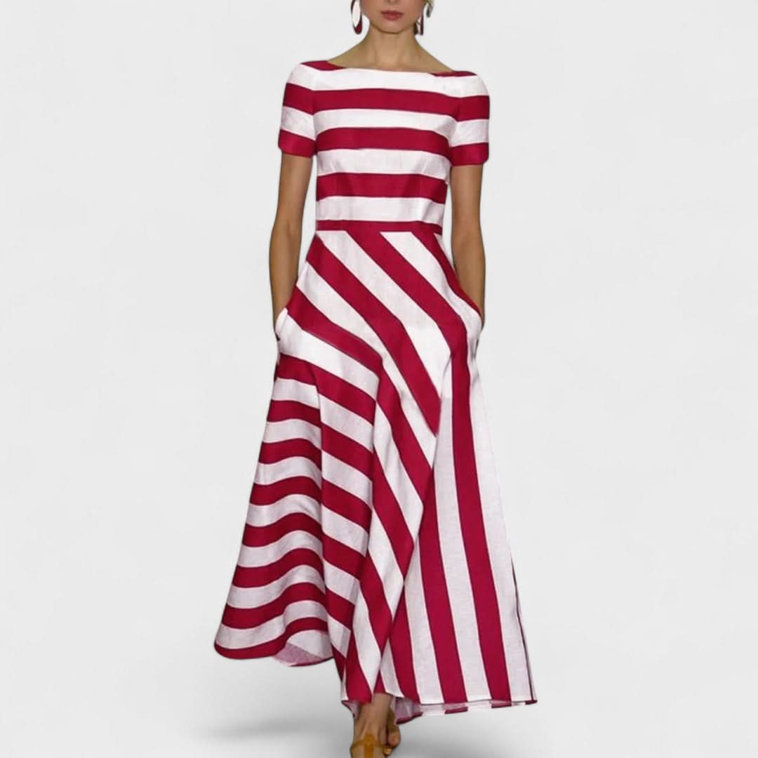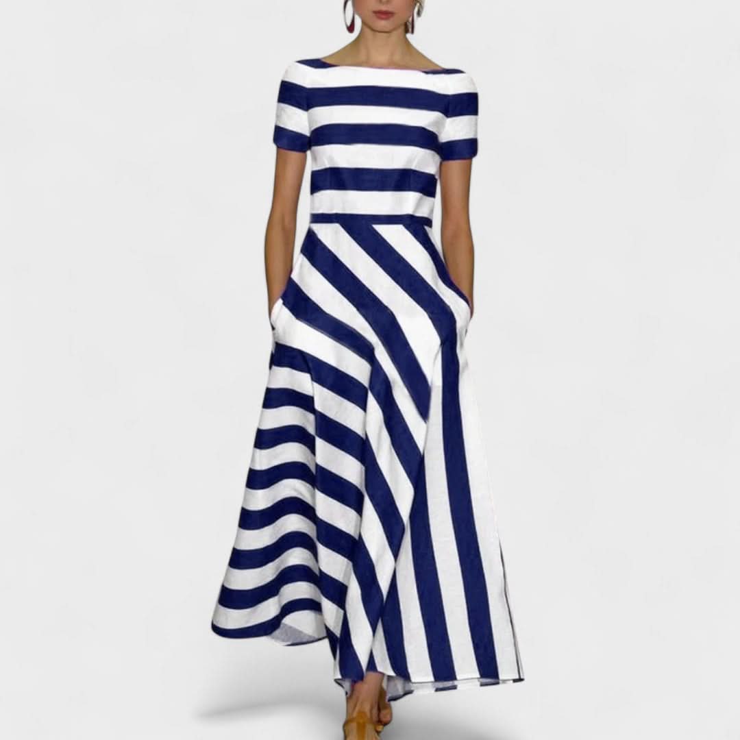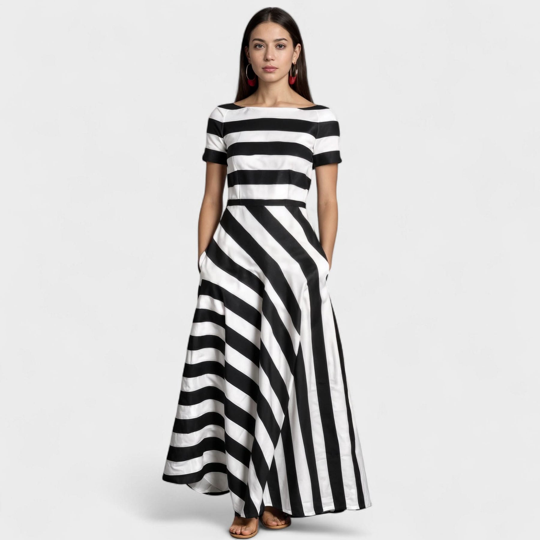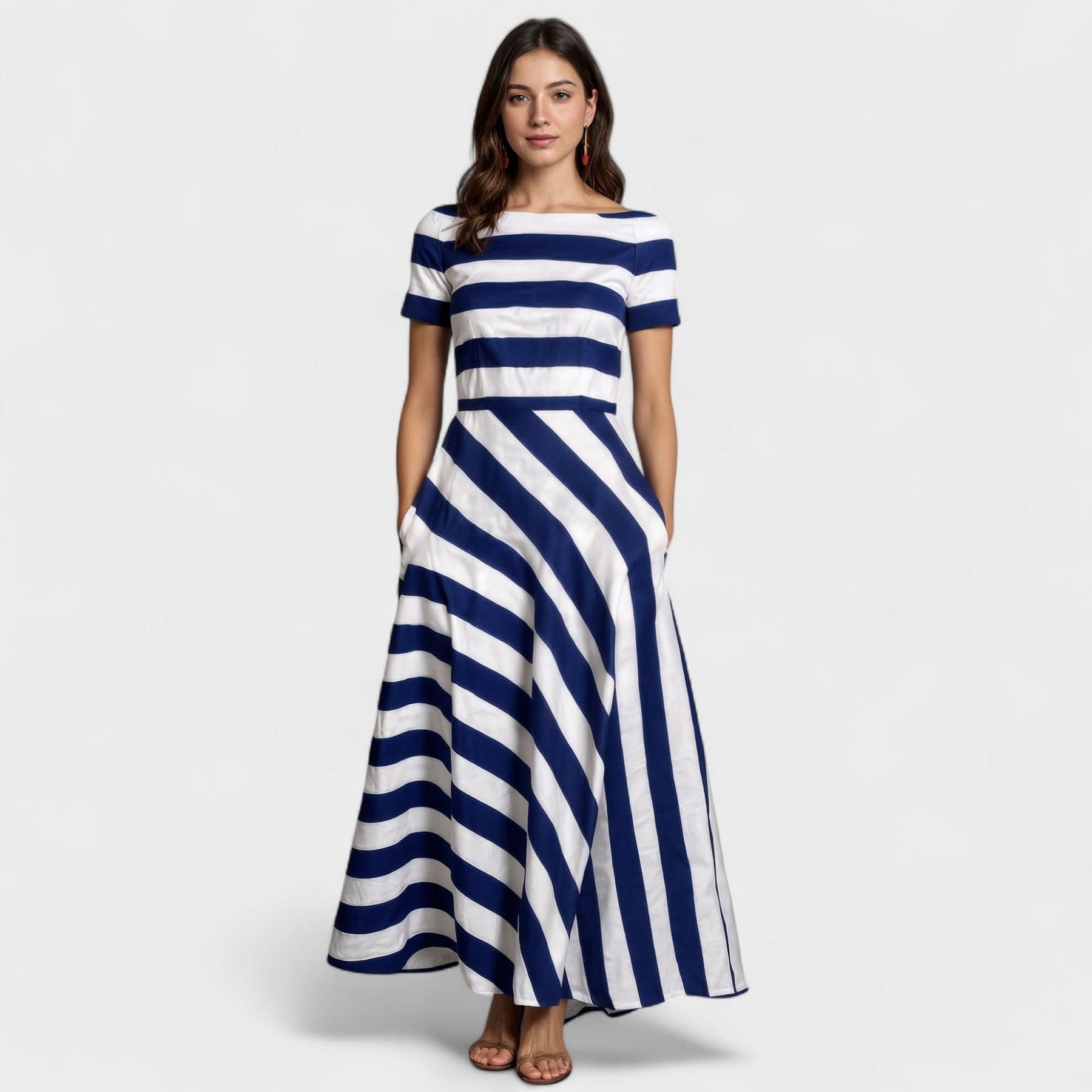 Платьето Марина предлага свежа комбинация от елегантност и лятна свобода. Раираната шарка в контрастни цветове придава грация на фигурата, докато удобният крой с скрити джобове осигурява максимален комфорт за ежедневието.