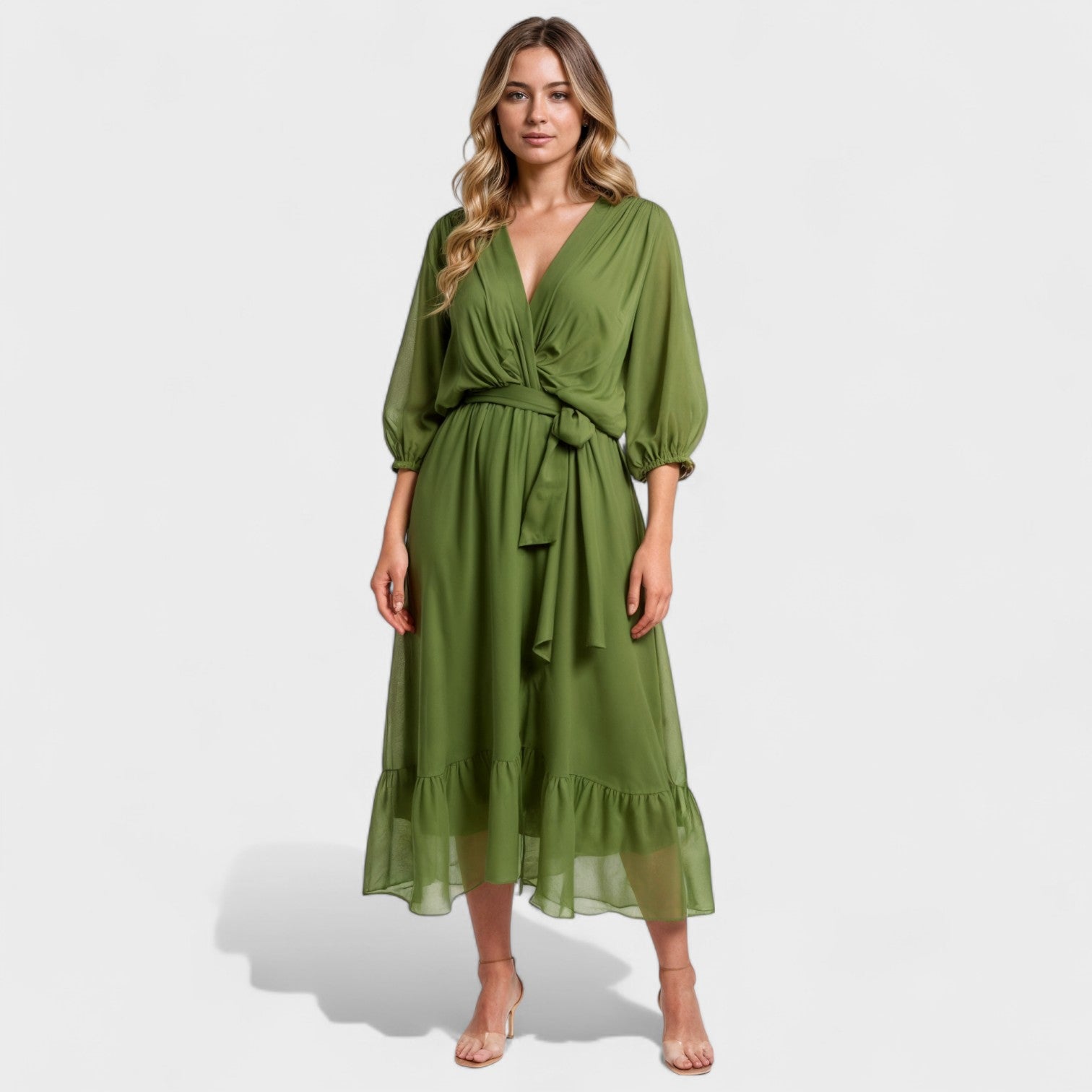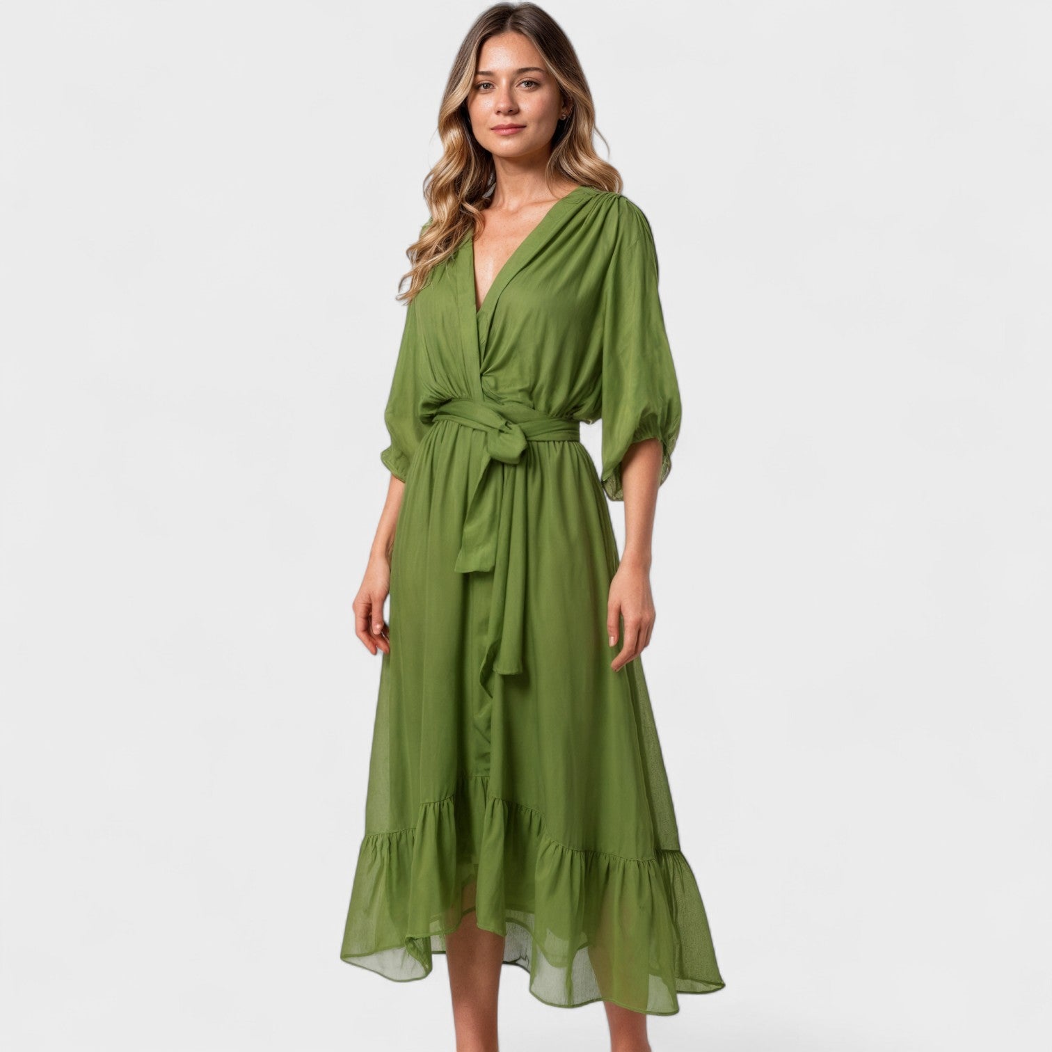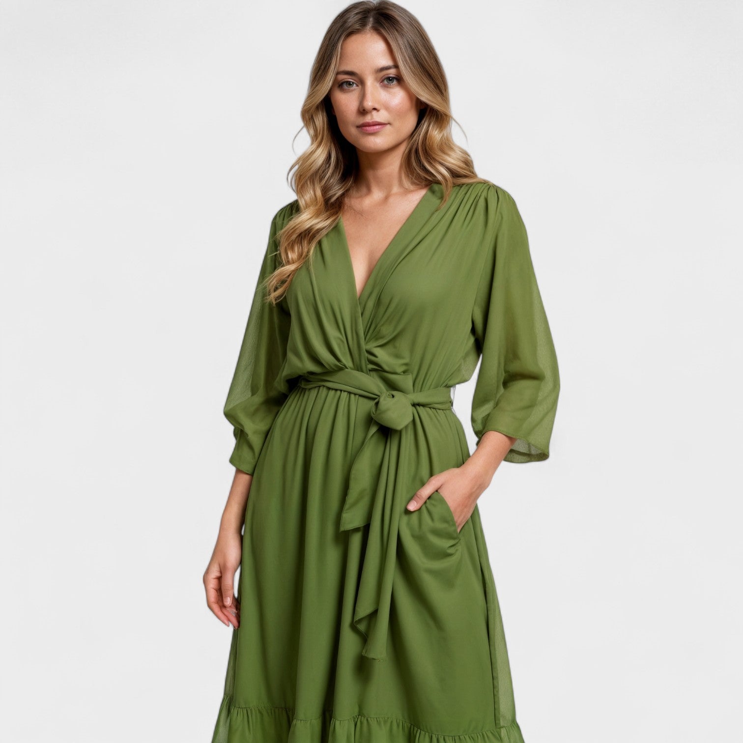 Открий магията на простотата с нашата оливково зелена рокля с обвивка. Лекото кроене, което подчертава силуета, три четвърт ръкавите и нежният V-образен деколте правят този модел идеален избор за всеки повод – от ежедневни моменти до тържествени събития.